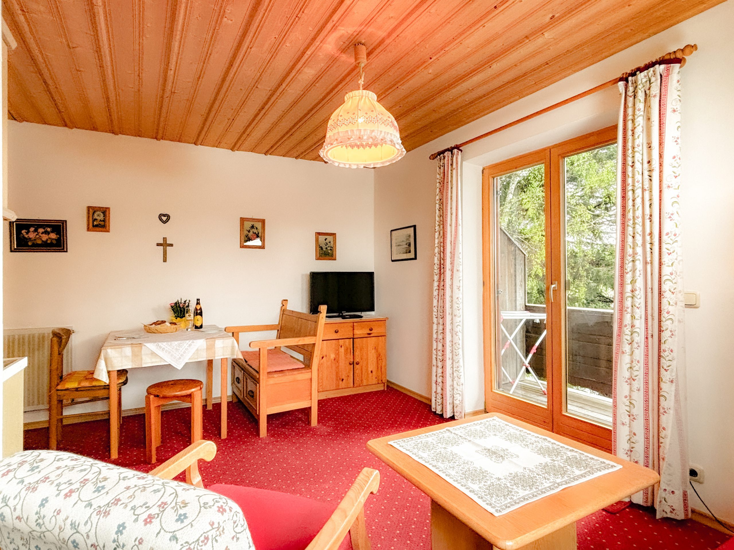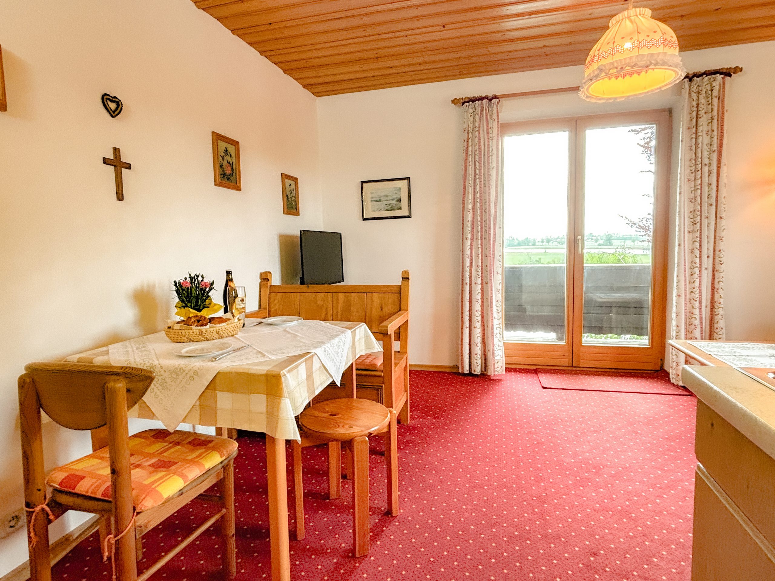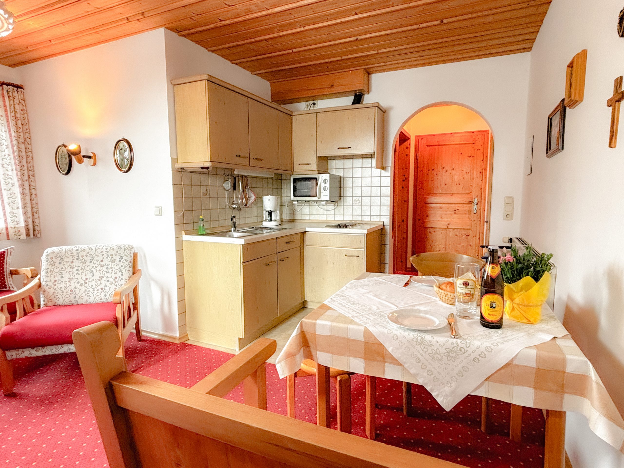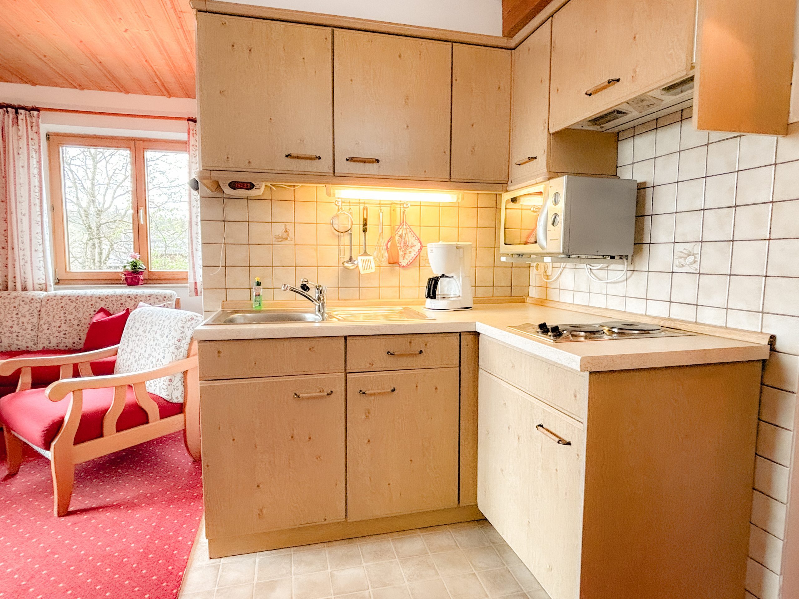 - Kleine voll ausgestattete Küchenzeile in der Wohnküche mit Wasserkocher, Kaffeemaschine, Toaster, zwei Kochplatten, Mikrowelle und Kühlschrank mit Gefrierfach. Daneben befindet sich der Esstisch und eine Couchgarnitur mit Couchsessel und SAT-TV