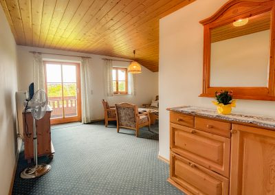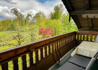 - kleiner Balkon mit vier Sitzgelegenheiten und kleinen Tisch mit Blick zur Alz & Chiemsee